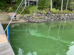 Androscoggin Lake has experienced serious algal blooms over the last few years. A lake-wide algal bloom is recognized by the state when water clarity drops below 2m. When a bloom begins to occur, ALIC alerts lake residents by e-mail to the condition and to possible harmful effects, especially near shorelines where green scum has formed.